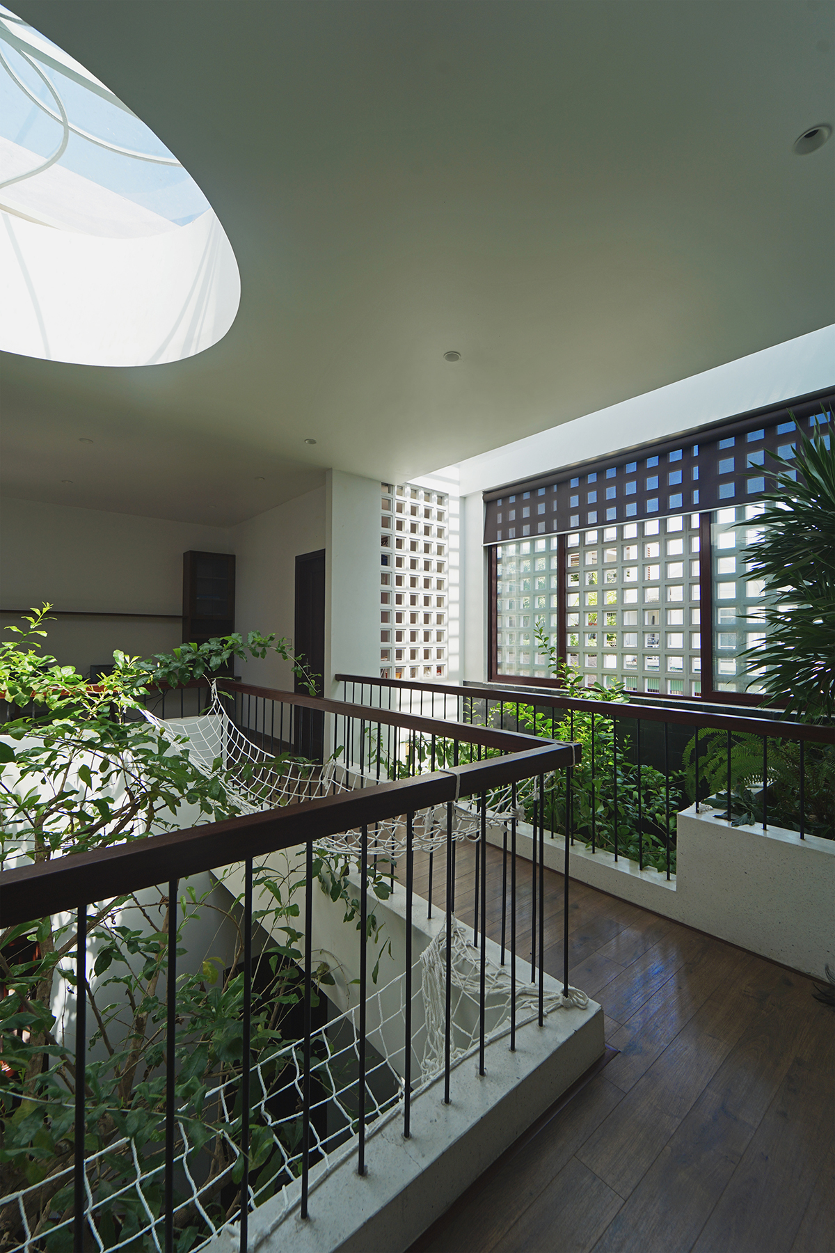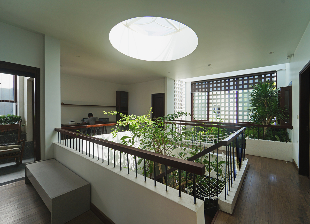 Ưu tiên hàng đầu được gia chủ đặt ra là nhà thoáng mát, nhiều cây xanh, có nhiều không gian sinh hoạt chung. Từ đây, nhóm kiến trúc sư đã thiết kế một lõi xanh giữa nhà. Lõi xanh này là sự kết hợp giữa khoảng thông tầng với giếng trời, cùng với mảng gạch thông gió phía sau tạo ra không gian đối lưu, giúp điều hòa không khí cả ngày.