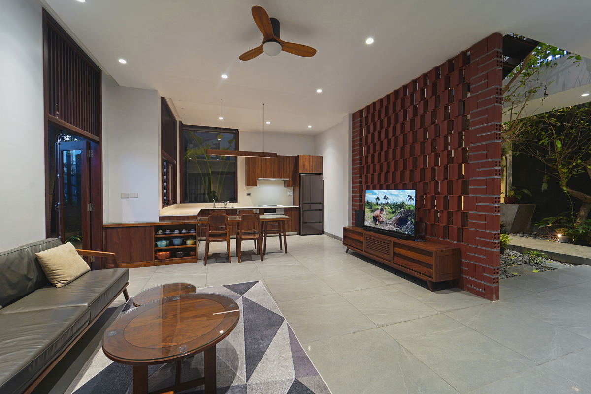 Bức tường gạch thông gió đóng vai trò vách ngăn phân tách không gian giếng trời và khu sinh hoạt chung. Hệ tường này kết hợp với hệ lam đón gió phía mặt tiền khiến trong nhà luôn mát mẻ.