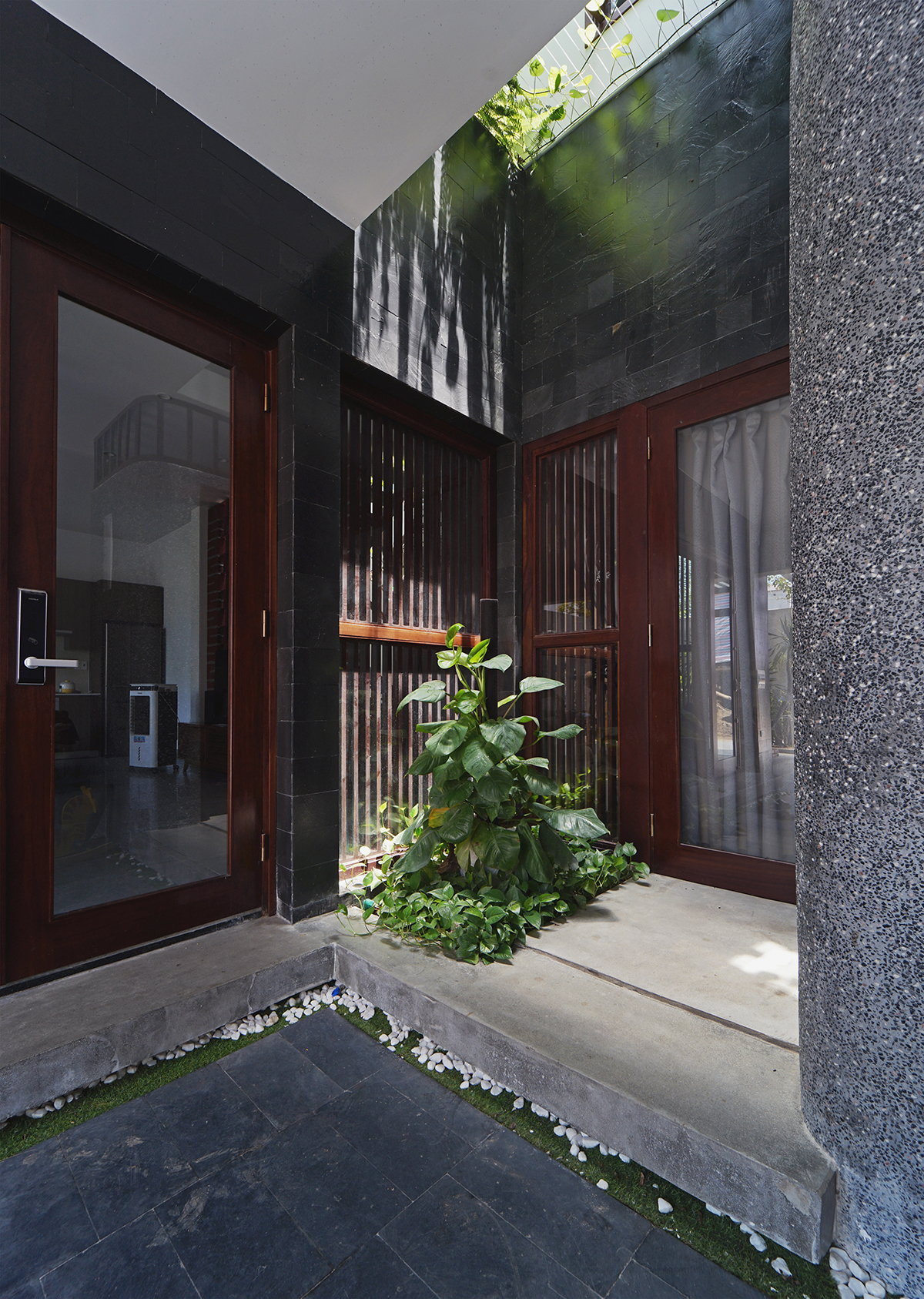 Tận dụng trục nhà hướng Đông Nam, mặt tiền được mở những hệ cửa nhỏ để lấy gió suốt cả ngày. Các luồng khí này tới lõi trung tâm, được điều phối nhờ 3 ô thông tầng bố trí xen kẽ giữa các phòng. Bởi vậy hơi nóng được thoát ra ngoài nhờ khoảng thông tầng, không khí được lọc nhờ cây xanh và khí tươi được lấy trực tiếp từ mảng tường bông gió phía sau nhà.